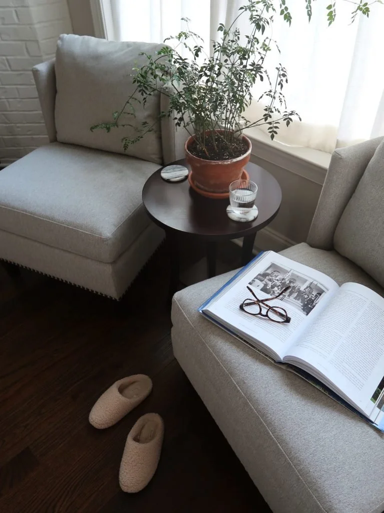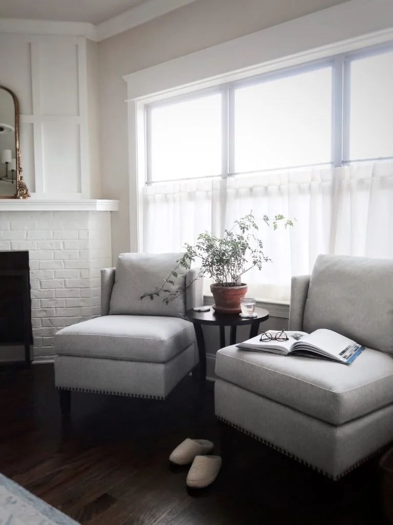 I also chose a set of slipper chairs by Thomasville, creating another relaxing area to unwind together. I love slipper chairs for their versatility and function. You can put them side by side, creating a settee-like piece, or place a table in the middle like I did here. You can also put them at the end of a bed, perfect for putting on your shoes in the morning. When I first saw these, I enjoyed the contemporary shape of the back, along with the plush cushions and soft fabric (herringbone gets me every time). They make for a sophisticated, yet comfortable addition to our home.
