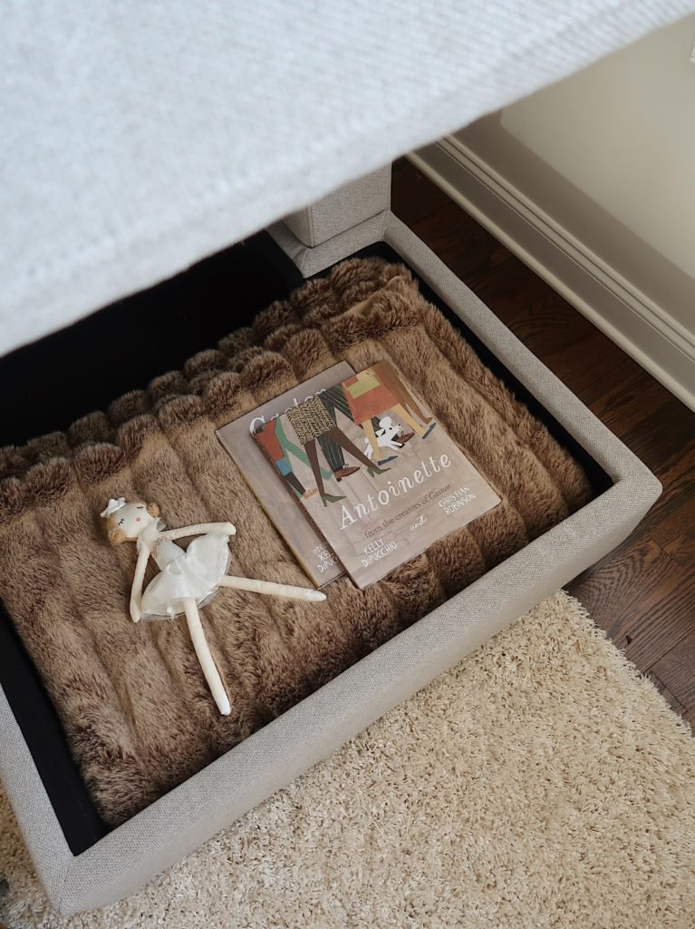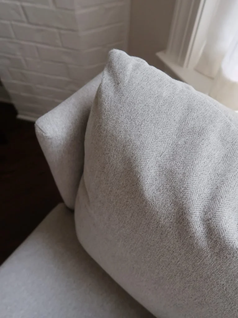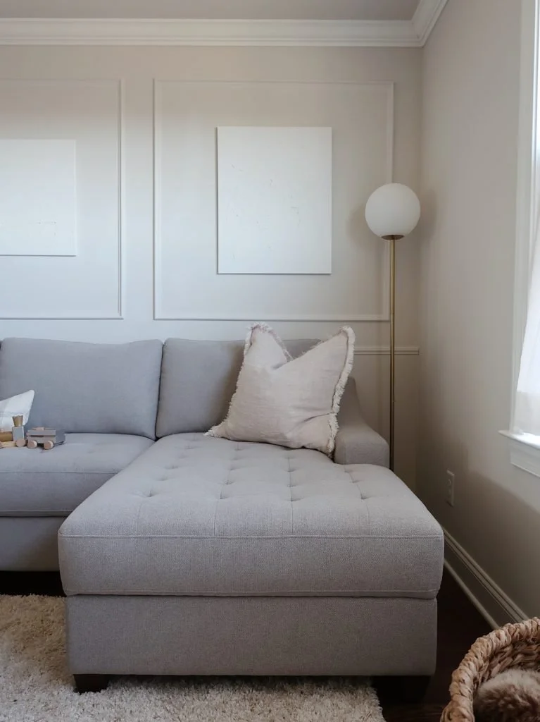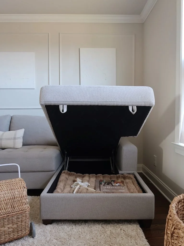 The piece of furniture in this room that really made my heart skip a beat was this sectional. Not only do I love the clean lines and the dual chaise, but it has built-in storage (!!) You can lift both ends to conveniently store blankets, toys and books. If this isn't what dreams are made of, I don't know what is. It brings joy to my soul to be able to easily clean up clutter and toys in an instant (is my motherhood showing?) And that's not all - Carson and I both have our own designated movie spots on each chaise. I also added a floor lamp for a cozy reading spot. What more could you want?