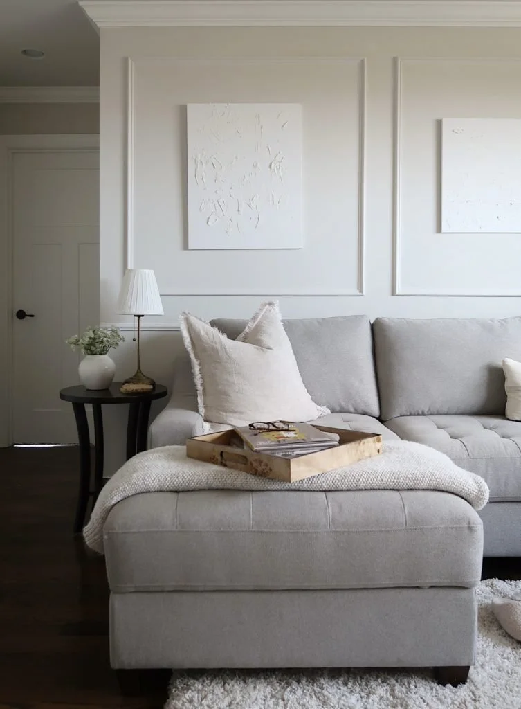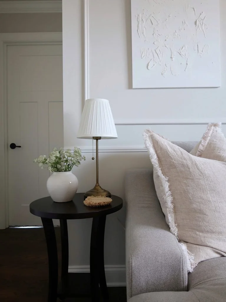For a fun and inexpensive DIY, I had Meriwether create some textured, monochromatic artwork for this space. I loved the idea of providing a fun activity for us to do, that would simultaneously add to our family room in a unique way. I gotsome canvases and let her go to town with white spackling paste from our local hardware store. She used a plastic putty knifeand her fingers to create the look, and I was shocked at how much I loved the end result. This little vignette is my favorite spot in the room, made complete with her artwork, a classic tiered end table, a brass lamp, and a vaseof fresh green florals.