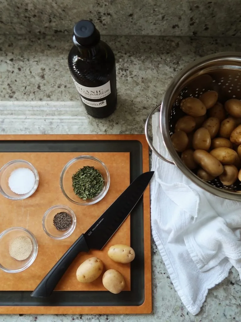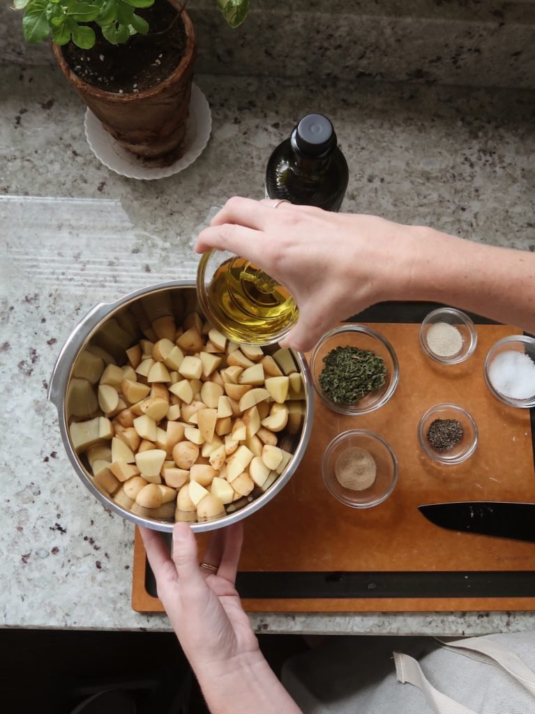 Cut the potatoes into quarters or halves, depending on the size. Place in a bowl and add olive oil, salt, pepper, minced garlic or garlic powder and onion powder. If you're using dried parsley, I add it into the mixture as well. Toss until the potatoes are well coated.