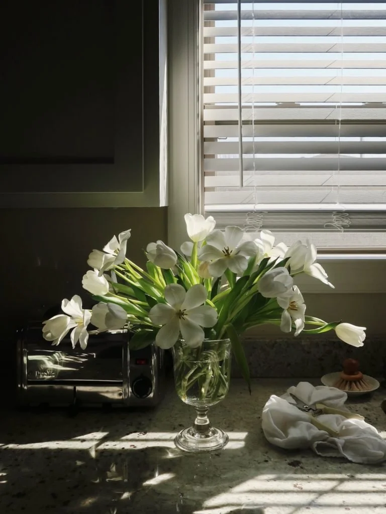 The weather has turned here in Nashville and the beautiful winter snow is gone. We rarely get snow, so it was a special treat for us! I know it'll get chilly again soon, but I'm enjoying this spring-like weather while I can. Being in the spirit, I picked up some white tulips at the grocery store the other day. I love watching Willow Crossley — arranging her delicate florals, and I figured I'd enjoy taking some time to follow suit. I linked a thirty second video below in case you're interested in watching!